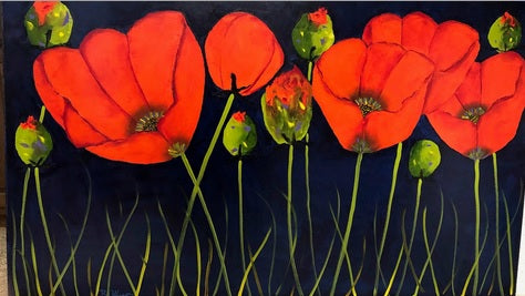 3 Red Poppies/ Blue 24x48